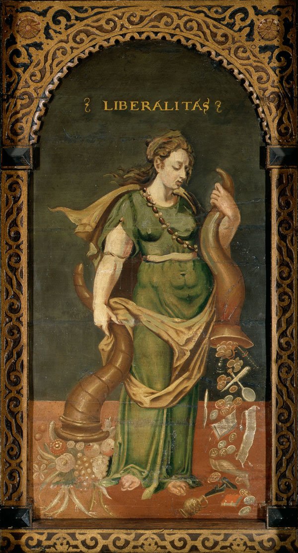 With DPG546, set into a Jacobean-style chimney piece in the Master's Library at Dulwich College. DPG546 and DPG547 are presumably survivals from the decoration of the old college. There is no evidence as to their origin, but it has been suggested that they may have been taken from 'ye queens owld barge', which Alleyn acquired in 1618. The figure of Liberality ultimately derives from 'Liberalita' in Cesare Ripa's "Iconologia" (1593).